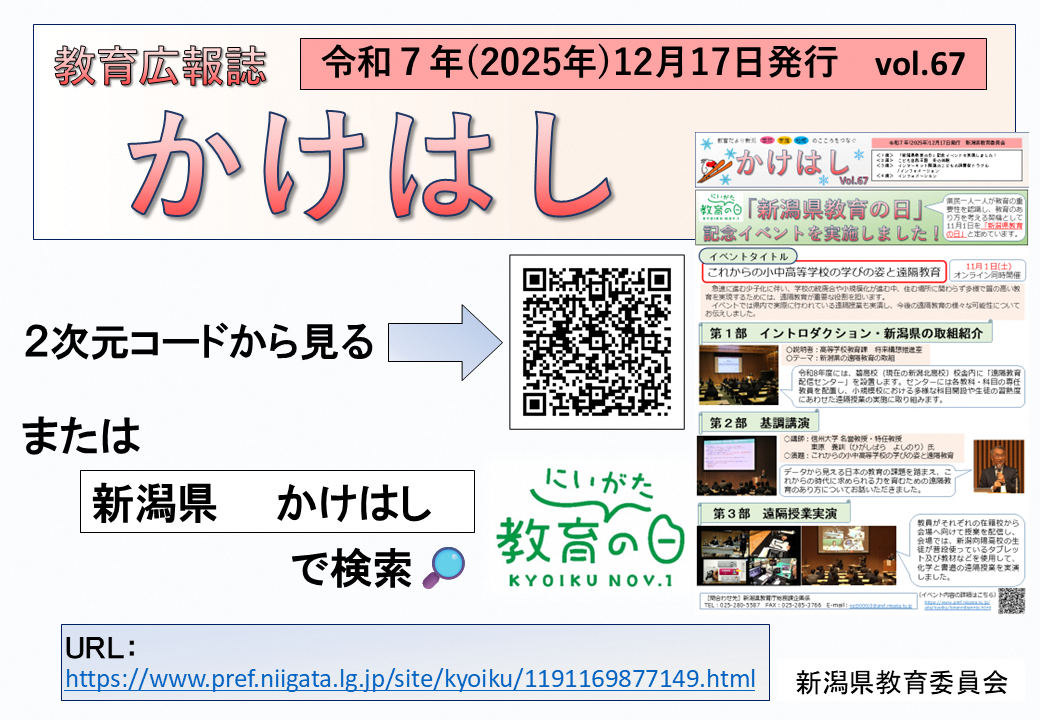 新潟県教育委員会 教育広報誌「かけはし」 58号(令和6年6月26日) 59号(令和6年7月26日) 60号(令和6年11月1日) 61号(令和6年12月6日) 62号(令和7年1月17日) 63号(令和7年3月10日) 64号(令和7年6月20日) 65号(令和7年7 月11日) 66号(令和7年10月17日) 67号(令和7年12月17日) 68号(令和8年1月16日)