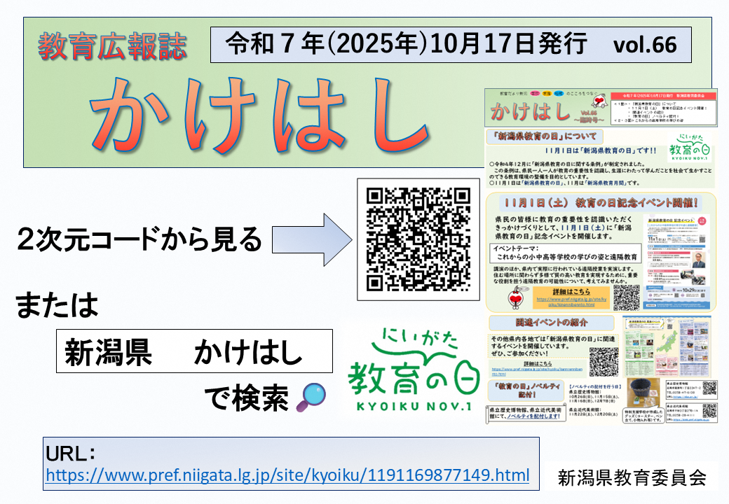 新潟県教育委員会 教育広報誌「かけはし」 58号(令和6年6月26日) 59号(令和6年7月26日) 60号(令和6年11月1日) 61号(令和6年12月6日) 62号(令和7年1月17日) 63号(令和7年3月10日) 64号(令和7年6月20日) 65号(令和7年7 月11日) 66号(令和7年10月17日)